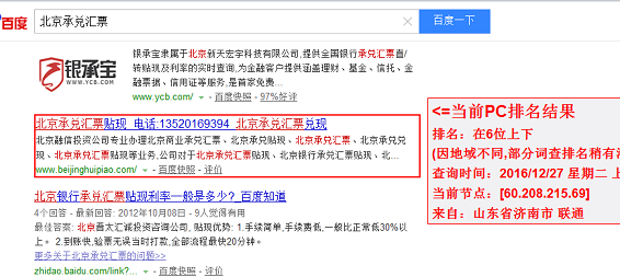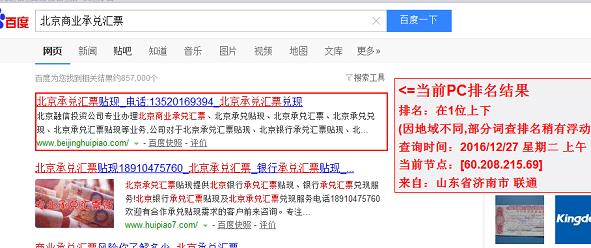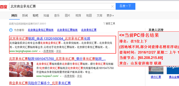 北京融信投资公司在2016年七月与北京seo俱乐部百度优化部进行和作,优化网站beijinghuipiao。com,优化关键词为:北京银行承兑汇票、北京承兑汇票和北京商业承兑汇票三个关键词。用时两个月,在九月底全部优化成功。现如今网站排名如下: